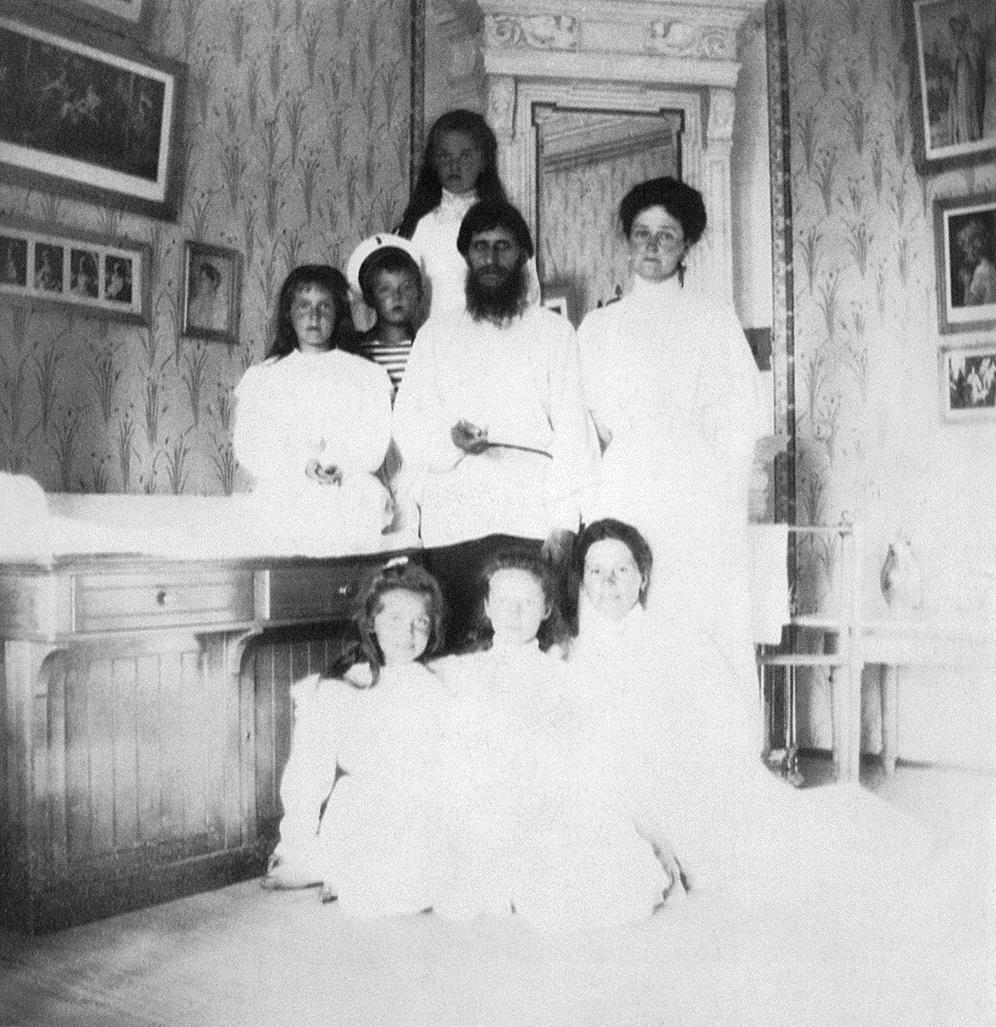 Empress Alexandra Feodorovna with Rasputin, her children and a governess. Empress Alexandra Feodorovna with Rasputin, her children and a governess.
